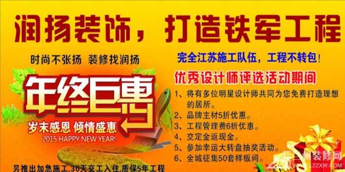 据了解,在润扬装饰成立九周年之际,润扬装饰特举行年底大型家装感恩钜惠活动以及优秀设计师评选活动,特推出加急30天交工入住,质保5年。届时有众多经验丰富的精英设计师为您免费做设计方案(平面布局和效果图),只要你提供户型图或者设计师上门量房,将有众多明星设计师共同为您打造理想的居所。此次评选活动由业主和公司共同完成,评选内容包括设计师的服务、设计方案以及设计师的讲解满意度。